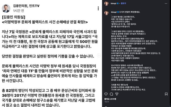 10일 김규리는 자신의 SNS에 더불어민주당 김용민 의원이 '이명박 정부 문화계 블랙리스트 사건 손해배상 판결 확정'이라는 제목으로 올린 게시글을 캡처해 공유하며 "드디어 판결이 확정됐다"는 글을 올렸다.