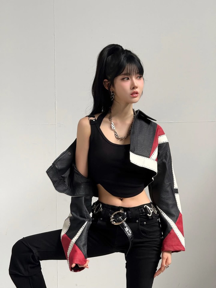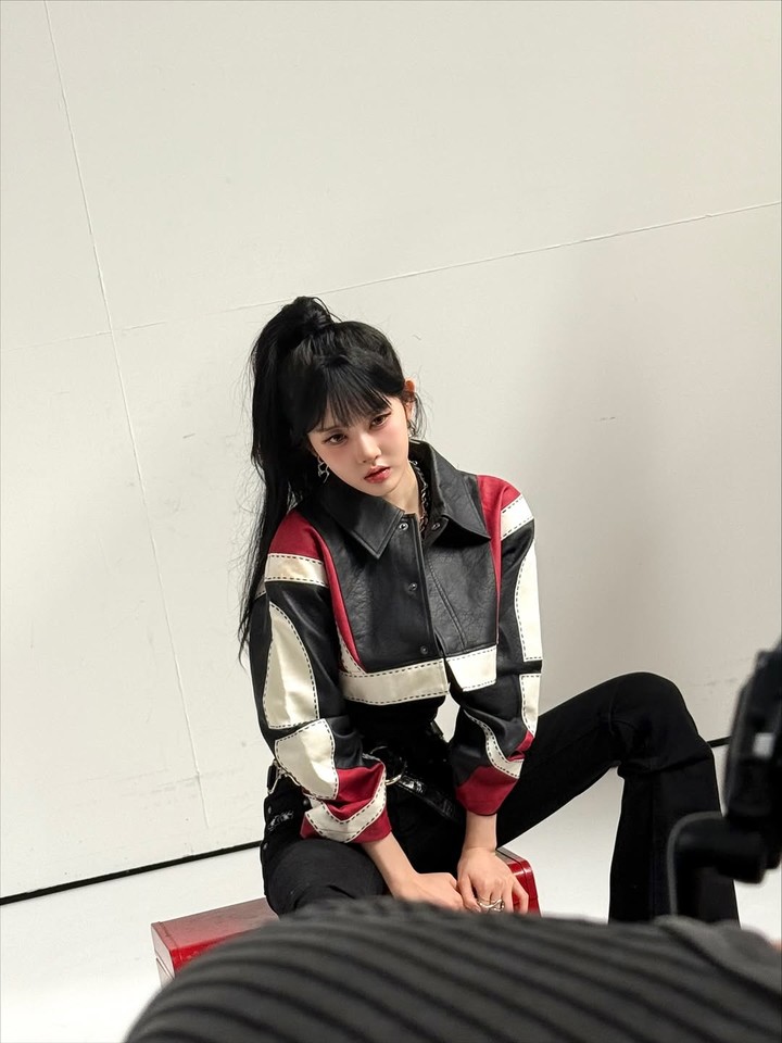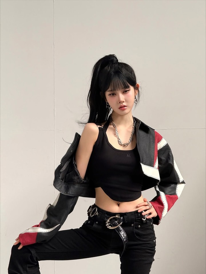 높은 포니테일 헤어스타일과 날렵한 눈매, 자신감 넘치는 포즈로 당당한 분위기를 자아내며 걸크러시 매력을 한껏 드러냈다.