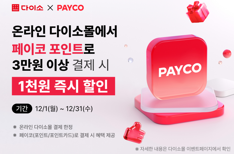 연말을 맞아 진행하는 이번 이벤트는 12월 1일부터 31일까지 진행하며, 다이소몰에서 페이코(포인트/포인트카드)로 3만원 이상 결제 시 1,000원을 즉시 할인해준다.