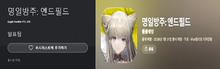 지난 11일까지 '명일방주: 엔드필드'의 출시일은 애플 앱스토어 기준 2026년 1월 31일, PS스토어는 출시일 미정으로 기재되어 있었기에 게이머들은 2026년 출시라는 정보만 알 수 있었다.