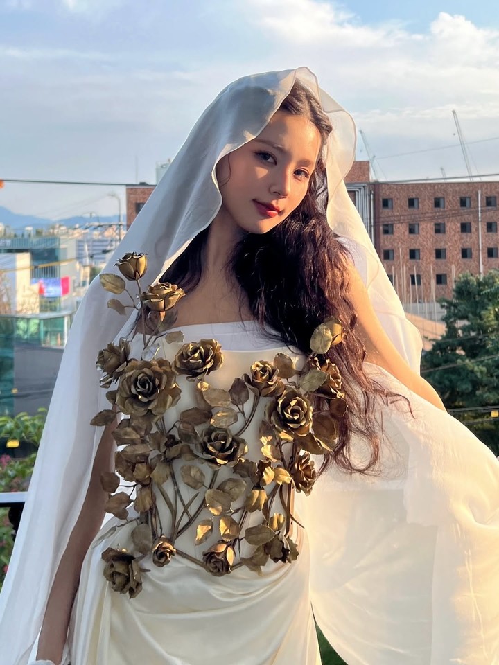 또 다른 컷에서는 순백의 베일을 두르고 골드 로즈 장식이 더해진 드레스로 ‘웨딩 무드’ 반전을 선보였다.
