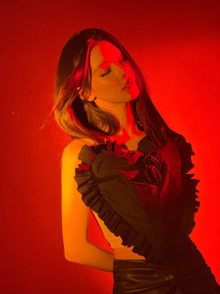 블랙 러플 드레스와 강렬한 레드 조명 컷에서는 분위기를 한층 과감하게 전환해, 미연 특유의 ‘청초함+치명미’ 스펙트럼을 보여줬다.
