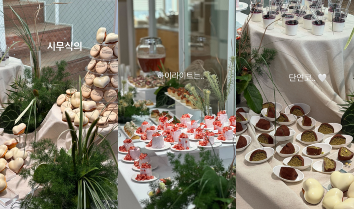공개된 사진에는 브랜드 로고가 새겨진 마카롱을 비롯해 고급스러운 핑거 푸드가 가득 차려진 시무식 현장이 담겼다. 특히 강민경은 “하이라이트는 단연코♥”라며 최근 자신이 푹 빠져있는 것으로 알려진 ‘두바이 쫀득 쿠키’와 ‘두바이 쫀득 김밥’이 산처럼 쌓인 모습을 공개해 눈길을 끌었다.