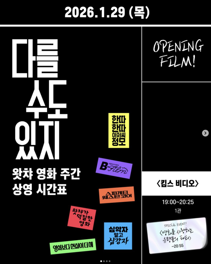 상영과 함께 다양한 관객 참여 이벤트도 준비됐다. 첫날 '킴스 비디오' 상영 후에는 '영화를 사랑하는 유령들의 파티'가 열린다. 서부영화 장르를 소개하는 '스파게티 웨스턴 코어 입문'도 진행된다. 영화 '헌터x헌터' 덕톡회, 영화 평론가 김경수와 함께하는 '밈이 빛나는 밤에' GV도 열린다.