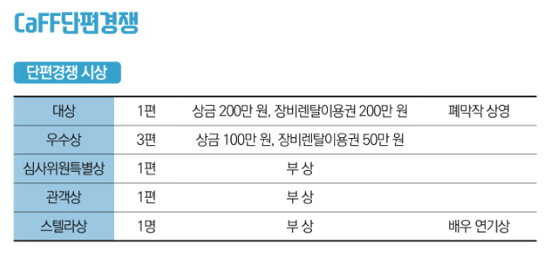 CaFF단편경쟁에서는 본선진출작 15편이 3개의 섹션으로 나누어 상영되며, 영화제 기간인 오는 25일에는 영화 상영 후 관객과의 대화의 시간이 이어진다. 이외에도 CaFF의 밤, 단편경쟁부문 수상작 시상 등이 영화제 기간 함께 진행된다.