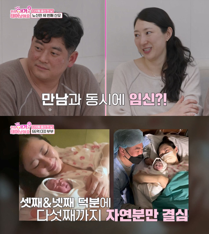 그러던 중 산모에게 진통이 시작됐고 출산이 임박했다. 출산 현장이 처음인 손민수는 남편보다 더 긴장한 모습으로 두 손을 꼭 모으고 기도했다. 산모는 천천히 힘을 주며 걱정과는 다르게 자연분만으로 순산했다. 다섯째 탄생을 만끽한 두 사람은 “운동하자 늙은 엄마, 아빠...”라고 장난을 치며 5남매와 함께할 앞날에 대한 기대감을 드러냈다.