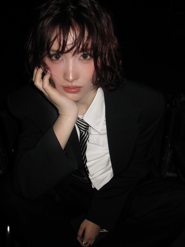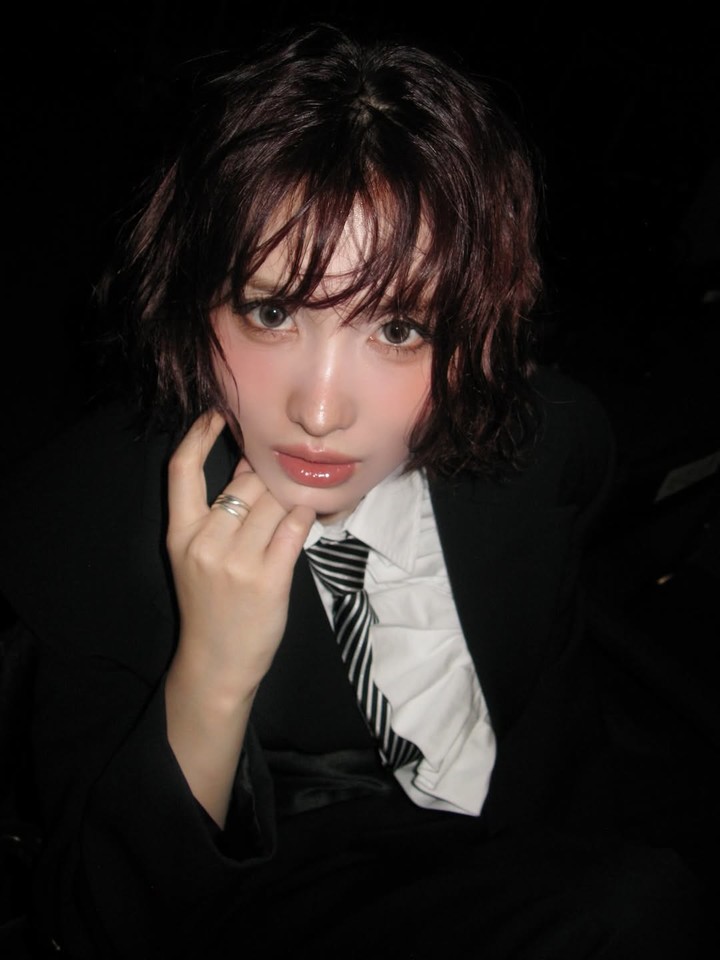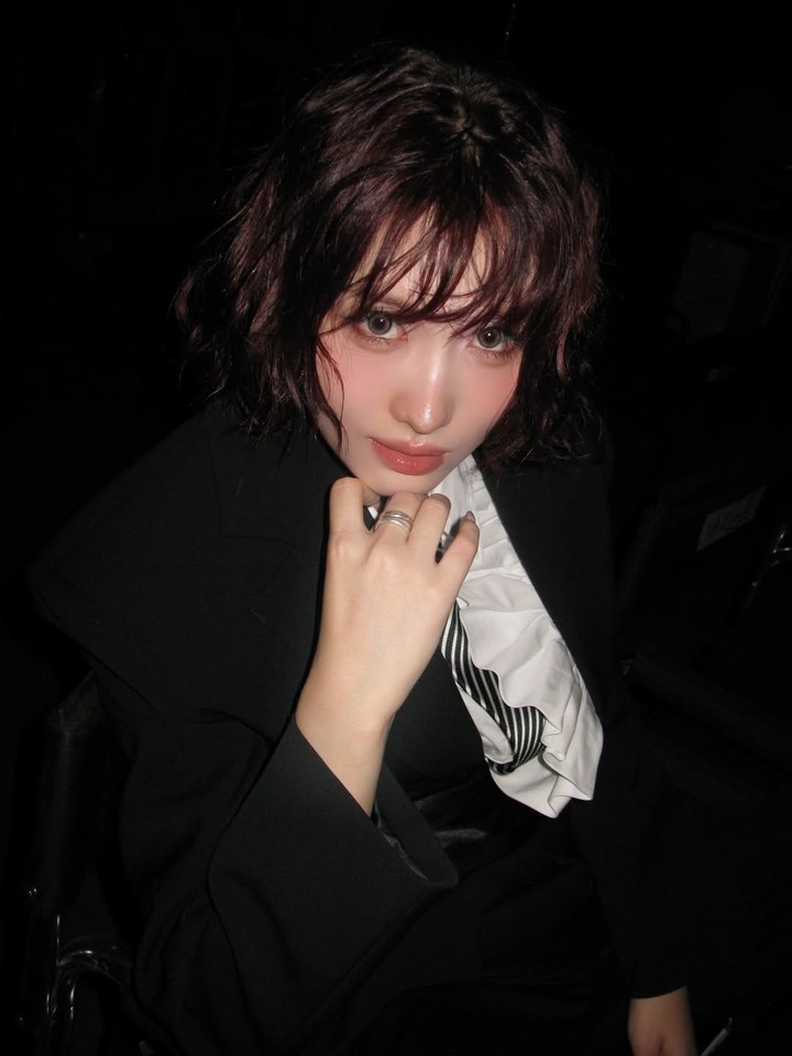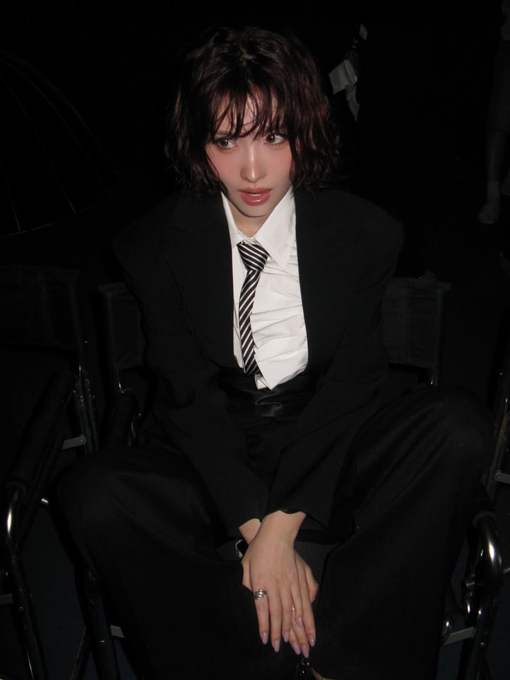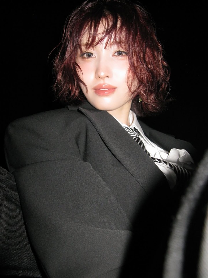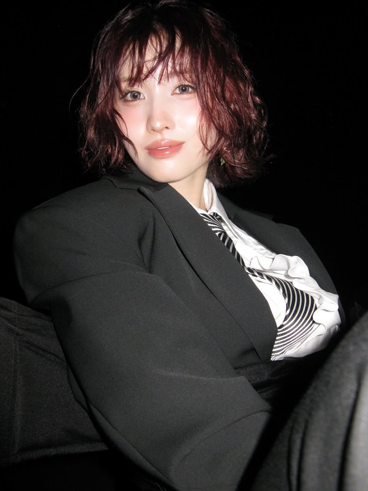 모모는 이마와 볼을 살짝 덮는 웻 헤어 스타일의 와인빛 단발로 몽환적인 분위기를 연출했고, 화이트 셔츠에는 프릴 디테일과 스트라이프 패턴 타이를 더해 포멀함과 유니크한 무드를 동시에 잡았다.