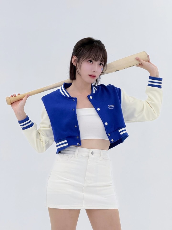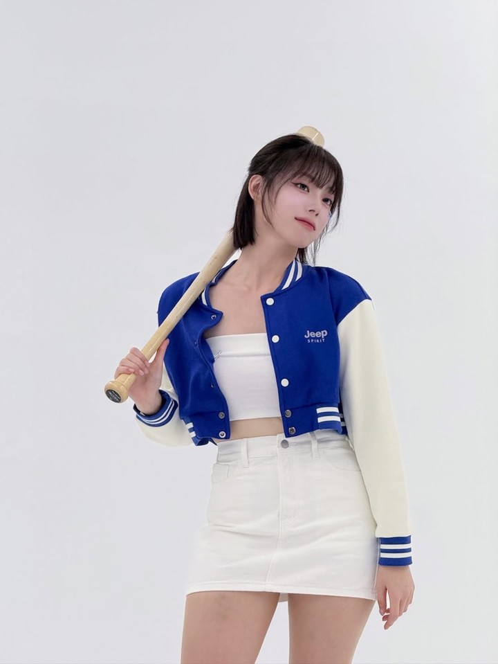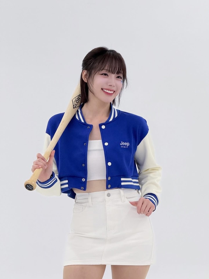 공개된 사진 속 하지원은 배색 스타디움 점퍼에 화이트 크롭 톱과 미니스커트를 매치해 큐티섹시 치어리더 스타일을 선보였다.