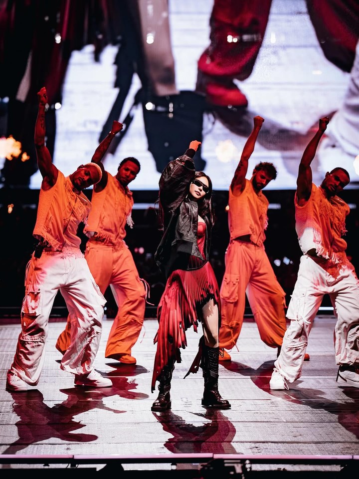 또 다른 컷에서는 블랙 선글라스와 가죽 재킷을 더해 카리스마 넘치는 룩을 완성했다. 부츠와 레드 장갑까지 디테일을 갖춘 제니의 스타일은 무대 위에서의 존재감을 극대화시키며 관객들의 열띤 반응을 이끌어냈다.
