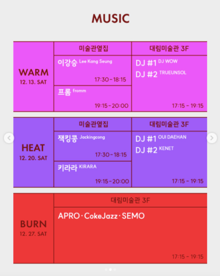 주목받는 아티스트들의 라이브 공연은 매주 토요일 대림미술관 옆집과 3층에서 진행된다. 오는 13일에는 이강승, 프롬이 무대에 오르는 'WARM', 20일에는 잭킹콩, 키라라의 'HEAT', 27일에는 APRO, CokeJazz, SEMO의 'BURN' 공연이 준비되어 있다. 공연은 무료 예매 후 선착순 입장하는 스탠딩 형식이며, 현장에서는 DJ WOW, TRUEUNSOL 등의 디제잉과 주류(신분증 지참 필수)도 제공된다.