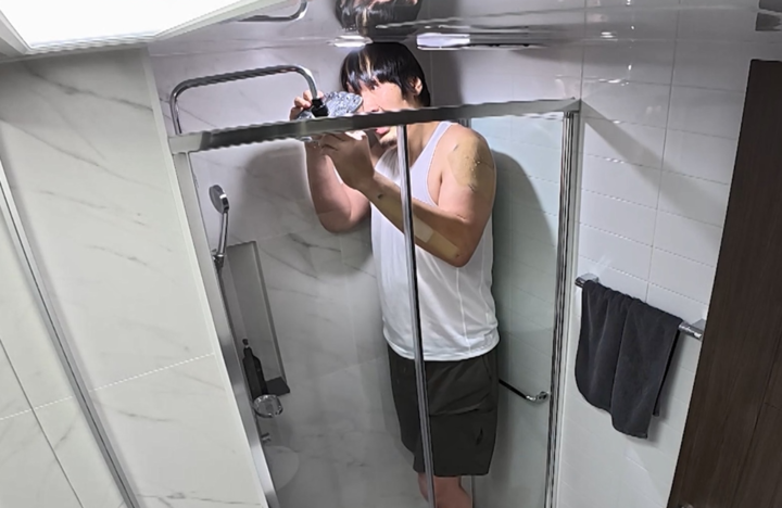 이어, 소인국에 사는 거인에게 또 하나의 시련이 찾아온다. 머리를 감기 위해 들어간 샤워부스가 홍만에게는 너무나 꽉 끼었던(?) 것. 허리를 굽히는 것조차 힘든 공간에 몸을 구겨 넣은 그는, 결국 팔을 샤워부스 밖으로 뻗어 자신만의 머리감기 신공을 선보인다.
