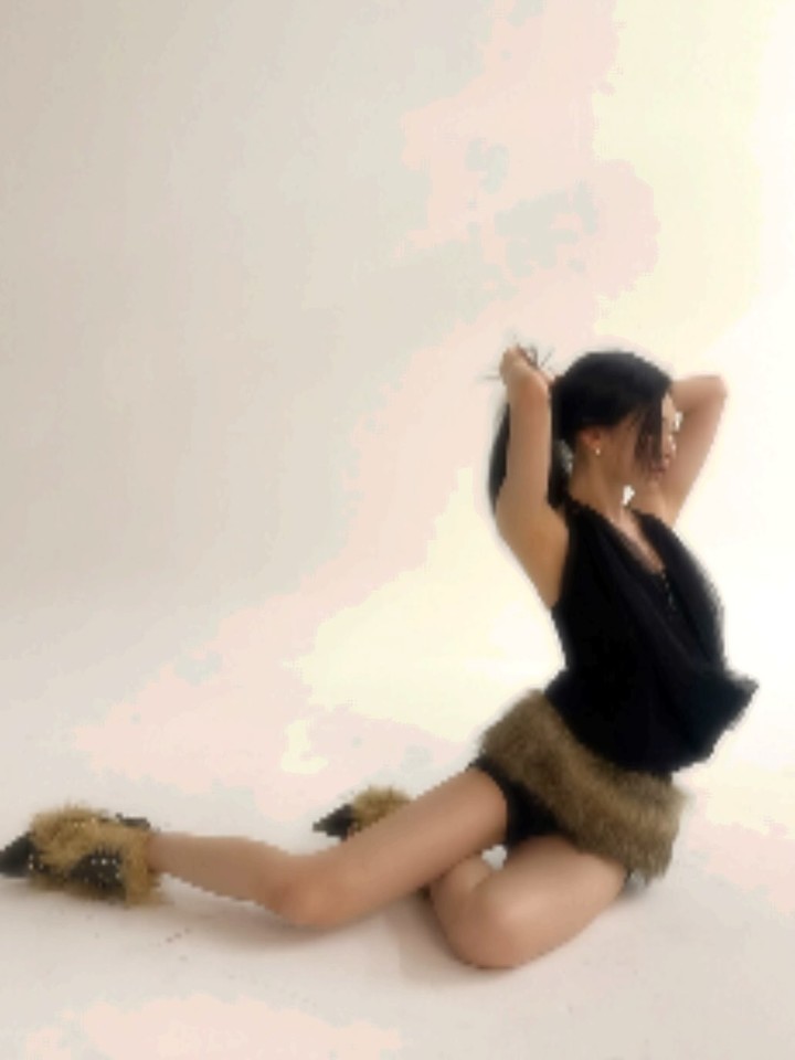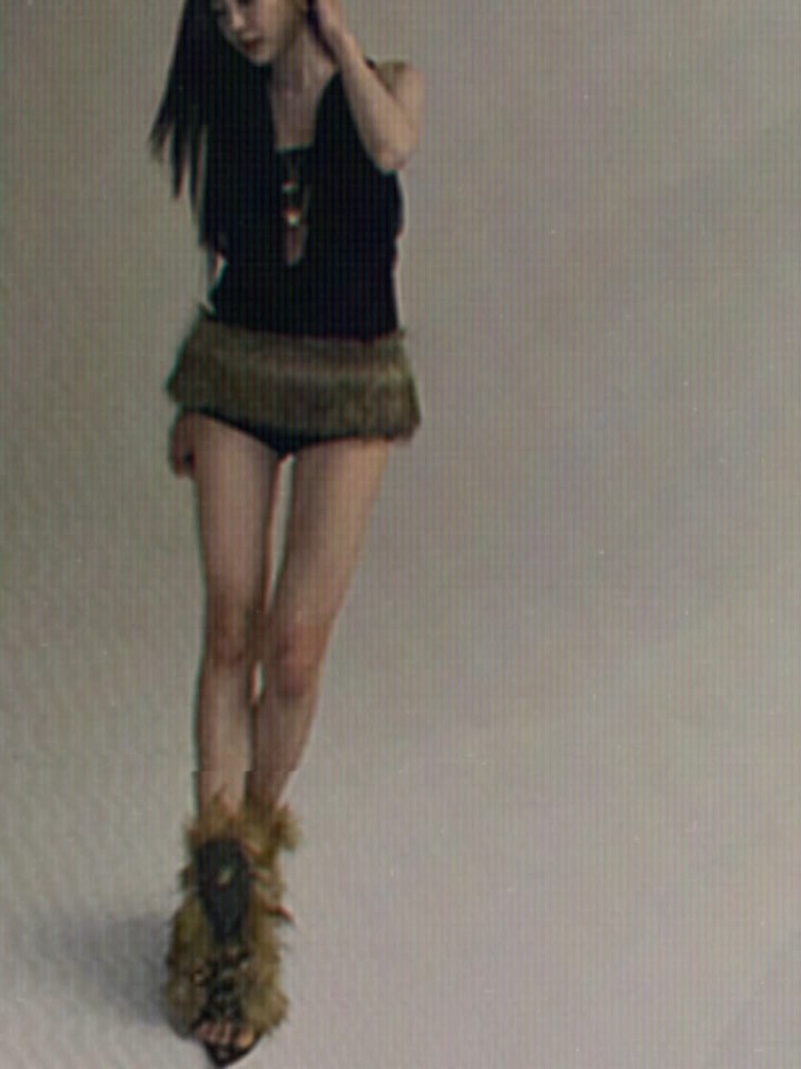 여기에 퍼가 더해진 유니크한 슈즈를 매치해, 단순한 ‘노출’이 아니라 패션으로 밀어붙인 과감함을 완성했다.