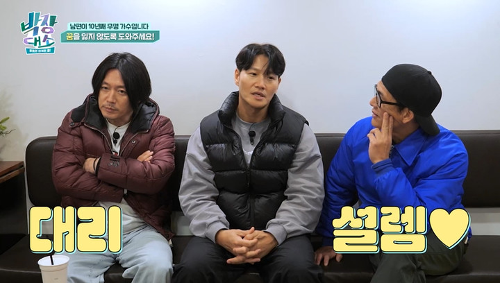 이날 ‘박장 브로’와 김종국은 “남편이 10년 차 무명 가수다. 현실적인 이유로 가수를 그만 두려고 하는 남편에게 희망을 달라”는 ‘콜’을 받는다. 이후 카페에서 만난 여성 신청자는 “두 분만 오시는 줄 알았는데, 김종국 님까지 나오실 줄 몰랐다”며 기뻐한다.