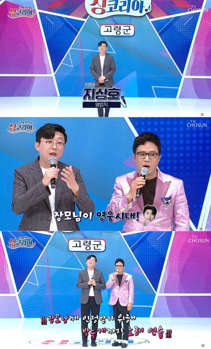 지난 봄 방송된 TV조선 '싱코리아' 고령군편 출연 역시 지상호에게는 또 하나의 도전이었다. 장모님의 권유에서 시작된 이번 도전은 2차 예심에서 아쉽게 고배를 마셨다가, 녹화 전날 밤 뜻밖의 추가 섭외 연락을 받게 되면서 이뤄지게 됐다.