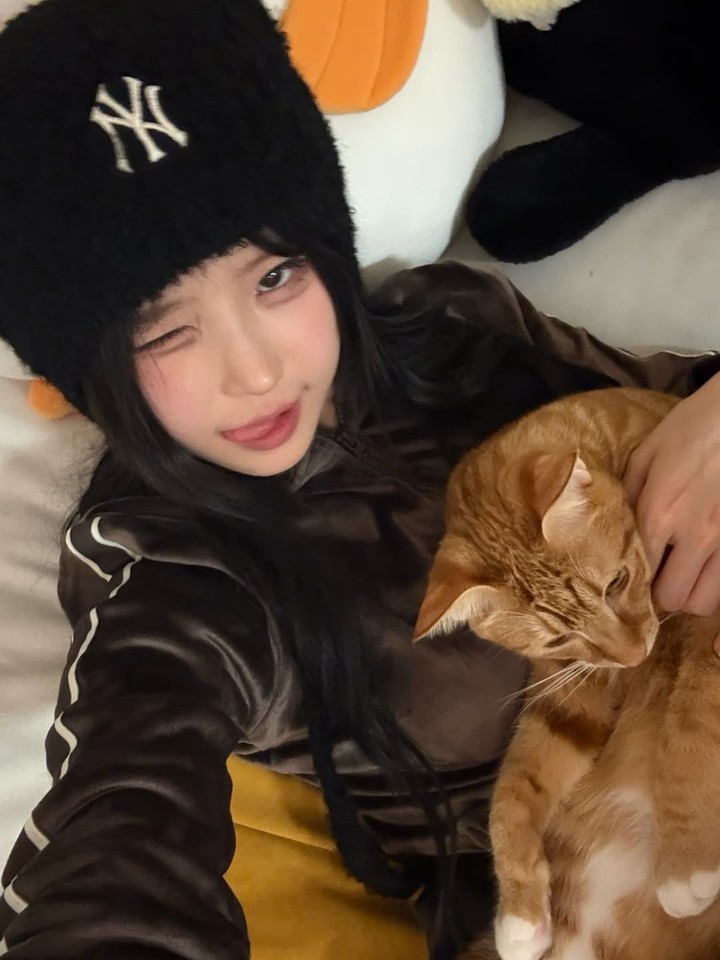또 다른 컷에서는 벨벳 소재의 집업 트레이닝룩을 입고 카메라를 가까이 응시하거나, 장난스러운 표정과 윙크로 반전 매력을 드러냈다. 특히 고양이 ‘호두’를 꼭 안은 채 다정한 스킨십을 나누는 모습이 더해지며, 집에서 더 빛나는 러블리 무드가 완성됐다.