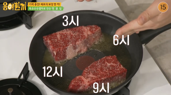 처음 고기를 팬의 3시와 9시 방향에 올려 굽기 시작한 뒤, 어느 정도 익으면 12시와 6시 방향으로 위치를 옮겨가며 익히는 방식이다. 그는 “이렇게 시간차를 두고 고기 위치를 바꿔줘야 팬의 모든 면의 온도를 골고루 활용해 가장 맛있는 스테이크를 완성할 수 있다”고 귀띔했다.